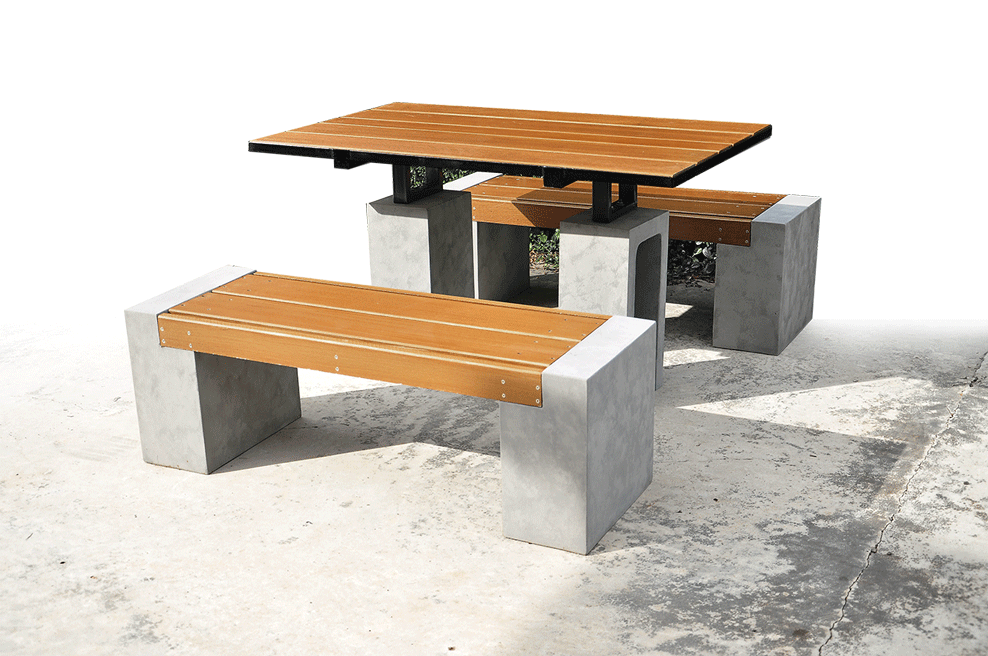 ชุดโต๊ะสนามแบบยาว 180ซม. คู่กับม้านั่งบล็อครุ่นมาตรฐานความยาวพิเศษ 170ซม. หนักแน่นทนทานต่อสภาพแวดล้อม ท็อปไม้ไฟเบอร์ซีเมนต์บนโครงเหล็ก ฐานไฟเบอร์เรซินผสมโครงเหล็กในเนื้อวัสดุ ด้วยการผสมปูนจริงในเนื้อวัสดุจึงยังคงถ่ายทอดสไตล์ปูนเปลือยที่เป็นเอกลักษณ์ได้เป็นอย่างดี