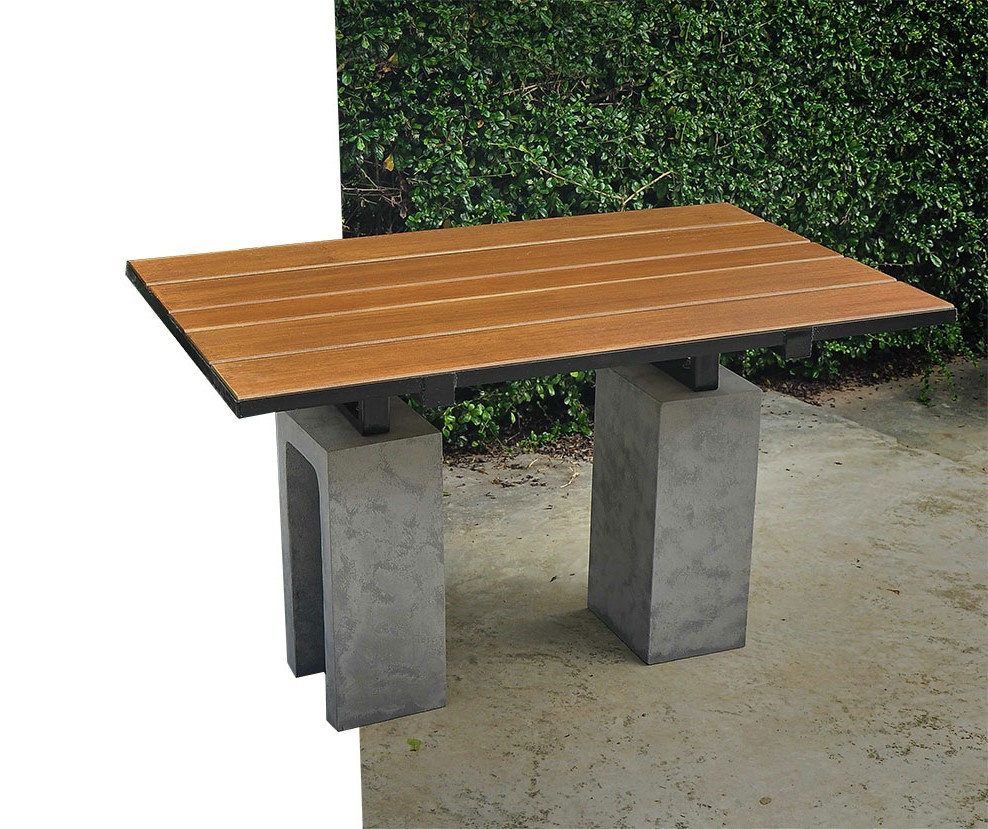 โต๊ะสนามรุ่นเล็ก สำหรับครอบครัวเล็กนั่งได้ 2-4 คน คู่กับม้านั่งรุ่นขนาด 120ซม. ได้หลายแบบ ท็อปไม้ไฟเบอร์ซีเมนต์บนโครงเหล็กพ่นสีกันสนิมดำ ฐานปูนซีเมนต์หล่อขึ้นรูป